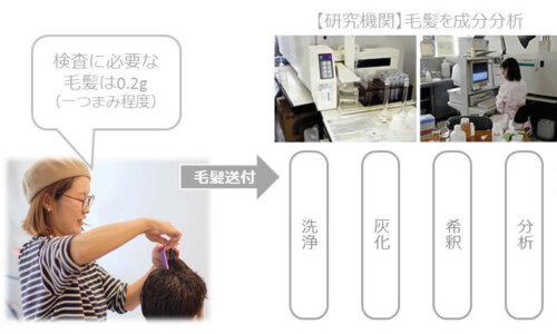 「icoi」に登録 → カルテ記入 → 毛髪採取 → 検査機関へ送付 → 3週間〜4週間程度でマイページに結果が届きます。